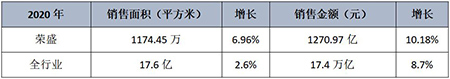 2020年,荣盛实现签约面积1174.45万平方米,同比增长6.96%;累计签约金额1270.97亿元,同比增长10.18%。而中国商品房全年销售面积为17.6亿平方米,同比增长2.6%;销售金额为17.4万亿元,同比增长8.7%。对比可知,无论销售面积和金额,荣盛均跑赢全行业,以较大优势领先于行业增幅。
